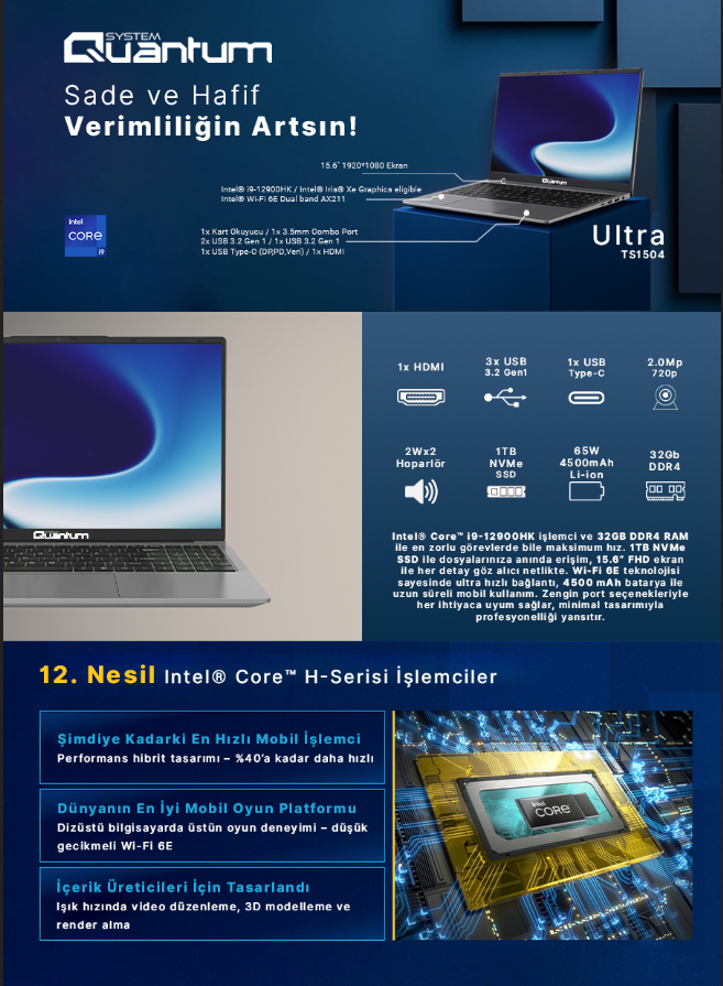 Performansta sınırları zorlayanlar için tasarlandı. Quantum Ultra TS1501 Notebook, Intel'in 12. Nesil mobil işlemcilerinin zirvesi olan Intel Core i9-12900HK ile donatılmıştır. Bu cihaz, en karmaşık 3D modelleme, yoğun video render işlemleri ve zorlu bilimsel hesaplamalar için gerekli olan ham gücü mobil bir kasada sunar. Bir FreeDOS iş istasyonu arayan profesyoneller için idealdir.